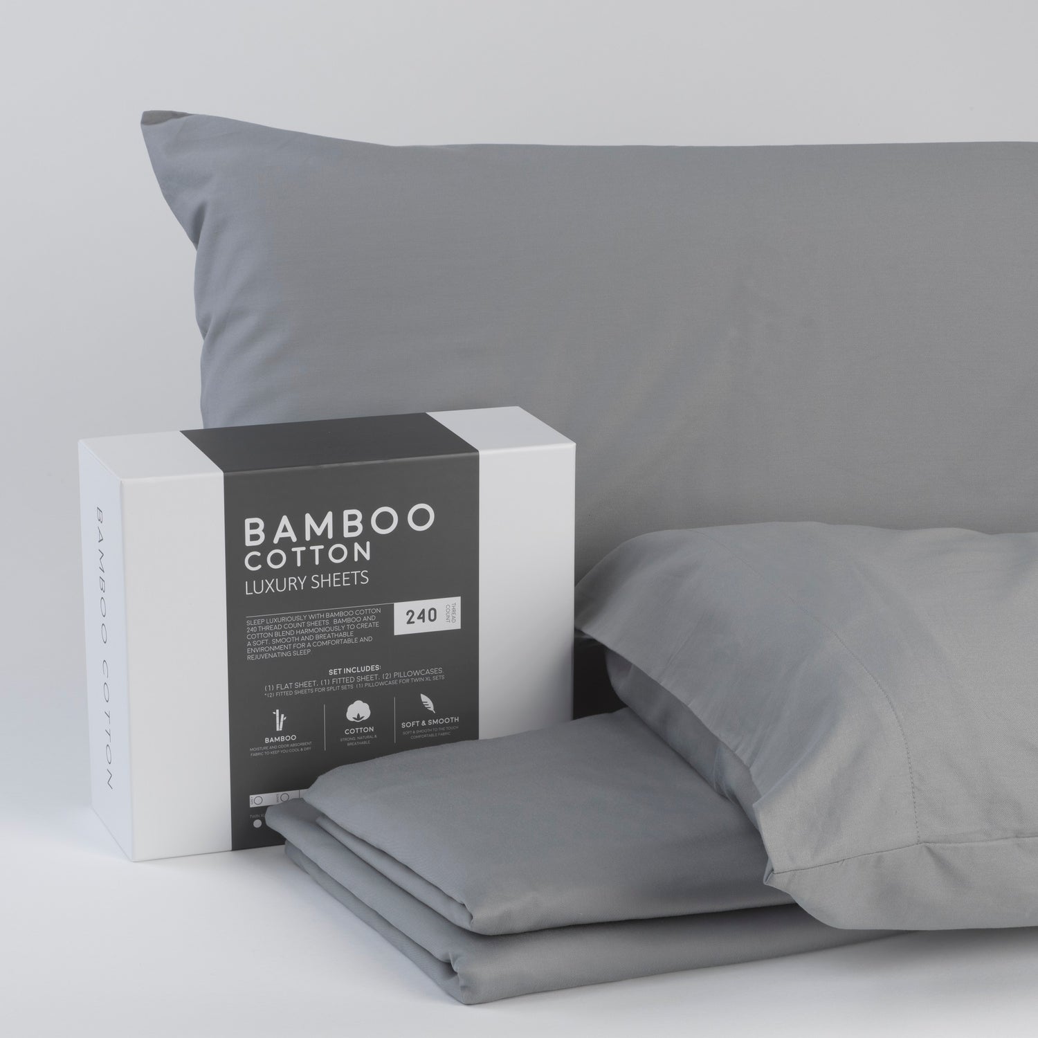 Our smooth and luxurious, 240-thread count sheet sets are woven from a soft, breathable blend of bamboo from viscose and cotton fibers that help keep you cool, dry and comfortable while you sleep. Available in grey or white and in all mattress sizes.